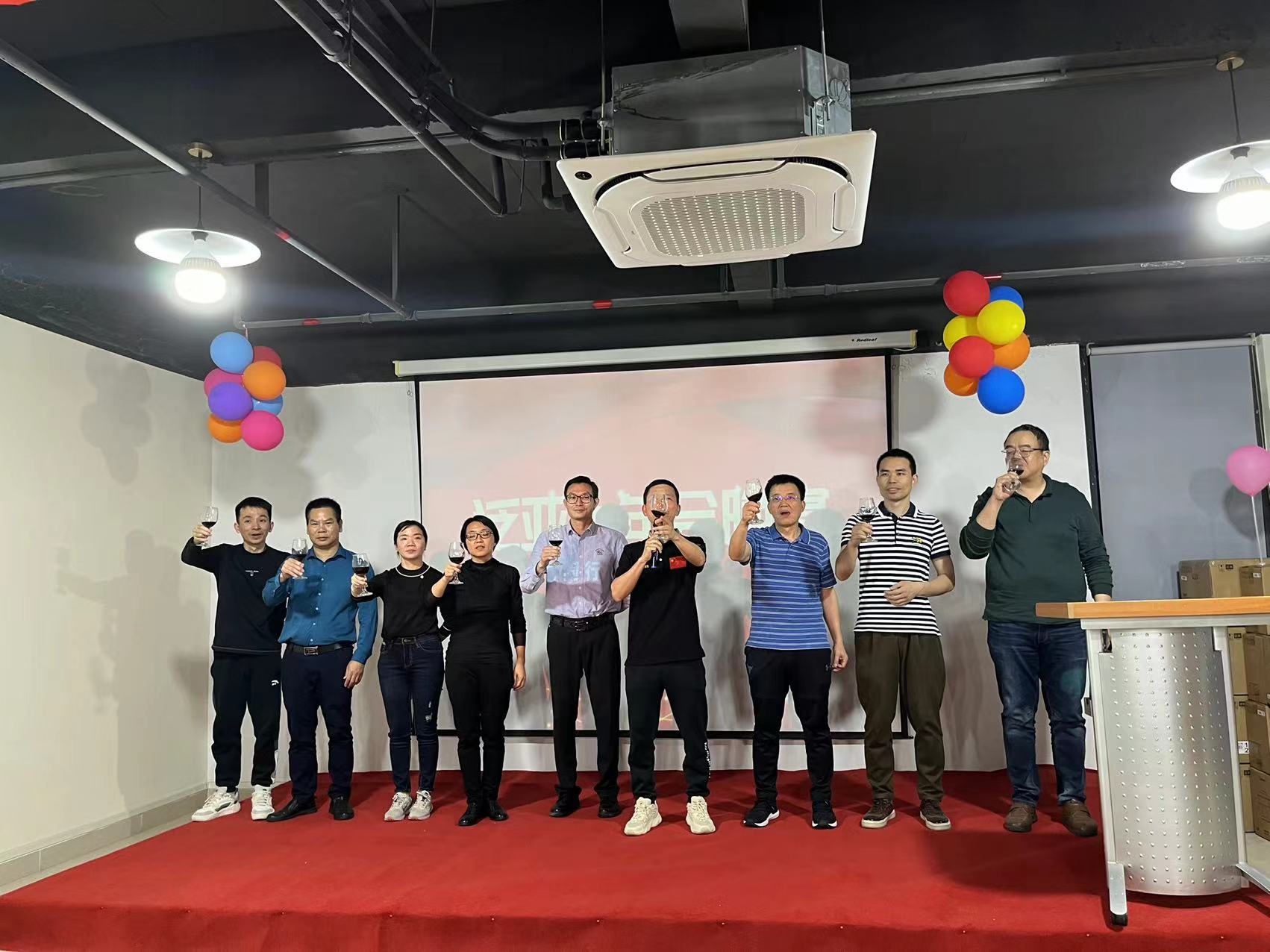 吳革華董事長和公司部門領(lǐng)導(dǎo)上臺祝酒,宣布晚宴正式開始!